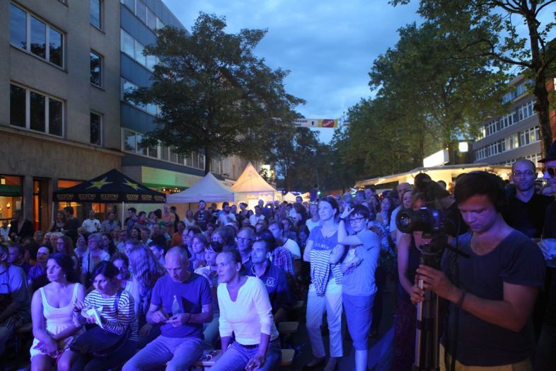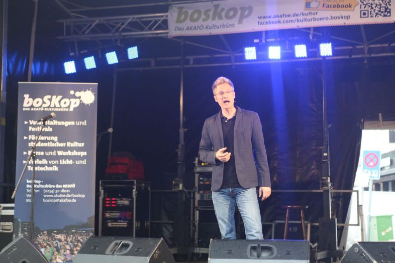 Politisch blieb es auch mit Benjamin Eisenberg, u.a. Mitglied des hochgelobten Kabarett-Ensembles „Nachgewürzt“. Der wortgewandte Bottroper hatte es jedoch schwer, das sich nun im Siegestaumel befindende Laufpublikum für sich zu gewinnen. Sein Auftritt fand in gemütlicher Atmosphäre statt, trotz immer lauter werdender Techno-Musik anliegender Stände. Inhaltlich blieb sich der Politkritiker treu. Hier ein paar Worte zur Europawahl, dort ein Appell zur deeskalierenden Politik im Ukraine-Konflikt. Dazu das obligatorische FDP-Bashing und der Aufruf zu mehr Wahlbeteiligung. Die Themen Eisenbergs waren vorhersehbar, die Umsetzung jedoch wie gewohnt bissig.
