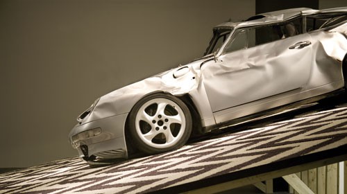 Zu jedem Objekt dieser „Träume über Kunst“ gibt es für mich als Betrachter eine visuelle Zwangsassoziation. Traum 1. Der Porsche von James Dean steht auf einem Teppich, der nicht nur zufällig an David Lynchs „Twin Peaks“ erinnern soll. Die Ölschinken darum herum in Baselitzscher Hängetradition. Traum 2. Wir sehen Beuys (gemeint ist hier die Performance „I love America and America likes me“ von 1974), sehen den Gorilla auf der Werkbank, denken an den Koyoten, den Käfig, aber auch an die großartigen Guerilla-Girls, die Künstlerinnengruppe die in den 1980ern New York rockte. Das Unterbewusstsein von Barbara Breitenfellner annektiert also Künstlerpositionen als kunsthistorische Haftnotiz, die dann als Buchstaben im Traumtagebuch wieder zu einer, vielleicht willkürlichen, neuen Komposition zusammengebacken werden. Das ganze wird von einer computeranimierten Leuchtwand aus Glühbirnen, wie man sie vom Zirkus kennt, angestrahlt und tosender Beifall brandet aus Lautsprechern hinter dem mit Boxhandschuhen und Beuysweste ausstaffierten Menschenaffen. Beuys bleibt eben Sieger, immer.