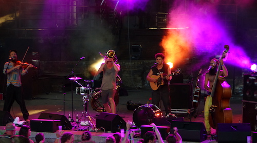 Kurz bevor Milky Chance ihren heiß ersehnten Auftritt ablegen konnten, spielte die Kölner Band Bukahara den Auftakt ihrer Sommer-Tour und wurde im Licht der Abendsonne zum heimlichen Highlight. Hochzeitstänze aus dem nahen Osten treffen hier auf Melodien irgendwo zwischen Folk, Reggae und Balkan Jazz. Musikalisch wie visuell ist die vierköpfige Band so besonders wie eine seltene Pflanze und das Duisburger Publikum verstand, sie zu schätzen. Als dann Headliner Clemens Rehbein und Philipp Dausch von Milky Chance schließlich mit erweiterter Band die Bühne stürmten, hatte man sich beinahe an den Ausnahmezustand Traumzeit gewöhnt. Viel rumgekommen sind sie in den letzten Jahren, seitdem ihr Song „Stolen Dance“ erstmals im Radio lief, und so zeigten sie sich dankbar für ein Konzert vor deutschen Fans. Die beherrschten textsicher auch die Songs des neuen Albums „Blossom“, welche tanzbar das Ende der Traumzeit besiegelten.