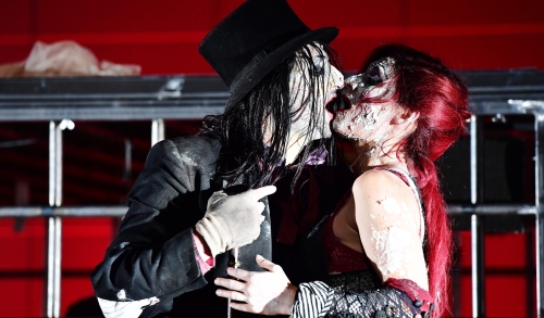 Das Bettlerensemble ist in einen punkigen Lumpenchic mit viel Streifenmuster gewandet, die Gesichter sind überschminkt, abblätterndes weißes Makeup, knallrote Lippen. Es wird um den zentralen Gefängniskubus herumchargiert, als ob es kein Morgen gäbe. Irgendwo zwischen Kasperletheater, Grand Guignol und expressionistischem Film. Ein großes Fratzentheater, das als Travestie der Dreigroschenoper daherkommt, die ja selbst schon eine Travestie der großen Oper sein soll. Das führt vor der Pause vor allem zum völligen Stillstand der Handlung um Maceath‘ Heirat mit Polly, der Tochter des Bettlerkönigs Peachum, und sein Verrat durch die Huren von Soho, die zu seiner Verhaftung führt.