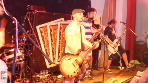 Nach kurzem Umbau betreten die sechs Italiener aus Marghera fast unbemerkt die Bühne. Schon nach wenigen Takten sind sie allerdings nicht mehr zu überhören und die Besucher kaum noch zu halten. Bereits beim ersten Stück wandert ein Stagediver über ohnehin nach oben gereckte Hände, der erste von vielen. Wo es aussieht, als würde am Sonntagmorgen auf gefliesten Boden zur Tanztee-Matinee geladen, bildet sich nun ein Pogopit. Drumherum schafft es niemand, die Füße still zu halten. Punkrock trifft bei Talco auf extrem tanzbaren Ska. Wunderbare Offbeat-Rhythmen, perfekt harmonierende Trompete und Saxophon werden durch den italienischen Gesang ergänzt. Die Sprache aus dem Land des dolce vita ist von Natur aus melodisch. Jeder Song sprudelt wie eine akustische Wundertüte vor Euphorie über. Die Fans danken es mit ausgelassenem Tanz und feiern Talco als gäbe es kein Morgen mehr. Der Raum ist eine einzige wabernde Masse, die kollektiv klatsch, sich hinhockt, aufspringt.