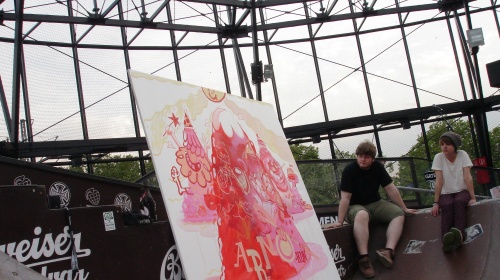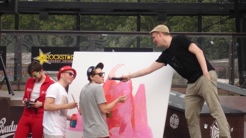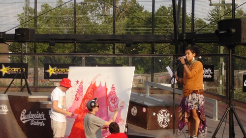 Eigentlich passte das (Un)Wetter auch thematisch zum Slam. Die Wolken, die sich tags zuvor zusammenzogen, um die Infrastruktur der Region zu zerlegen, entbehrten nicht einer gewissen Sinnbildlichkeit: Dunkle Wolken sind es auch, die mit der Schließung des Opel-Werks über Bochum ziehen. Umso passender war es, dass diese nun verschwunden waren und Sonne wie Versen Platz machten. Denn für den Slam im Rahmen des Detroit-Projekts wurde ein sonniger Ort auserwählt: Das Skate-Deck auf dem Boom Store, eigentlich Treffpunkt der Skater-Szene, bot nun der Slam-Zunft eine Kulisse mit bestem Blick auf das Bermuda-Dreieck. Wo normalerweise die Züge Richtung Hbf vorbeirattern, drang nur noch leise das Gemurmel des Treibens an der Kneipenmeile nach oben, zwischendurch vermengte sich der urbane Lärm von Sirenen oder Hubschraubern mit dem Versfluss auf der Bühne und verblüffte auch den routinierten Moderator Sebastian 23: „Alter, ich habe noch nie unter einem Hubschrauber moderiert.“