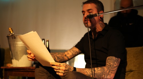 Sascha Bisley machte den Anfang. Der volltätowierte Sozialarbeiter aus Dortmund mit Hang zu Schnaps und Kippen eröffnete sein Heimspiel mit einer Anekdote aus dem Jahr 1989. Während ein paar 100 Kilometer entfernt der Mauerfall vorbereitet wurde, erprobten sich die Dorf-Kids aus dem Sauerland mit dem Konsum von halluzinogenen Pilzen, welche sie wohlwollend überdosierten. Kurze Zeit später erblickten sie neben auf Zeigefingern drapierten Luftschlangen auch die „Hebamme von Kreta“ am Firmament. Schon an dieser Stelle wurde deutlich, dass Bisley kein Mann der versteckten Botschaften ist. Was andere Autoren mit negativ belegten Adjektiven umschreiben, ist bei Bisley einfach „scheiße“. Seine rotzige, bewusst prollige, aber dennoch irgendwie liebevolle Art zu erzählen, passt zu seiner gesamten Erscheinung wie Fäuste auf Augen. Wer im Internet recherchiert, bekommt schnell die zutiefst rissige Biografie des Sascha Bisley serviert und damit auch die ein oder andere Erklärung für dessen Gesamtwerk.