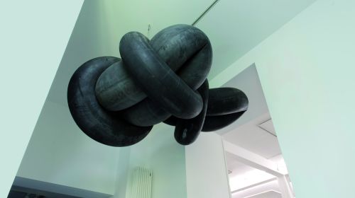Daran schließt in der Kunsthalle Recklinghausen nun die zwölfteilige Fotoserie „Antiherbst“ an. Jedes Foto zeigt den gleichen Blick auf einen Baum in der Landschaft, sichtlich im Herbst, nur in unterschiedlichem Tageslicht. Das Groteske aber ist: Der Baum steht in der vollen Pracht seiner Laubblätter ... – was es damit auf sich hat, erfährt man dann draußen, beim Besuch der „Emscherkunst“-Ausstellung. Ein ähnlicher Geist der Anarchie kennzeichnet die „Raketenbäume“ (2008) im oberen Stockwerk, zu sehen in fünf kurzen Videos, bei denen ein Baum auf einer Wiese mit lautem Knall mehrere Meter senkrecht in die Luft fliegt, ehe er, geradezu unbeholfen, wieder auf die Erde zurückfällt. Auch die „Wolke“ (2010), die Michael Sailstorfer aus grau-schwarzen LKW-Schläuchen geknotet und über den Köpfen aufgehängt hat, handelt mit dem „Draußen“. Freilich ist dieser Blick auf den Himmel ernüchternd, die Wolke, die noch an ein Tierwesen denken lässt, trägt schon die Umweltverschmutzung in sich: als Rekonstruktion einer Idylle, die doch das wenig Idyllische unserer Zivilisation zeigt. Kommentiert wird das Ganze im gleichen Stockwerk von präparierten Katzen, die hoch auf Sockeln den Mond in Form von grellen Strahlern anheulen – und natürlich heißt diese Arbeit „Solarkatzen“ (2012). So schön und bitter kann Kunst sein.
