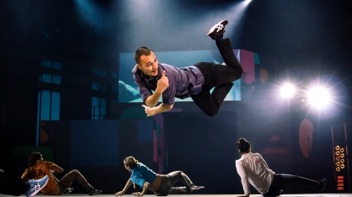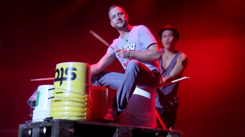 Schon am Eingang werden Ohrenstöpsel angeboten, denn hier erwartet die Zuschauer keine Lagerfeuergitarre. Das musikalische Konzept ist bei URBANATIX ebenso durchdacht wie das visuelle – womöglich sogar noch mehr. Denn wozu sollen Tänzer tanzen, wenn nicht zu Musik? Drei Meter hohe Podeste an jeder Seite der Bühne gehören nur den Schlagzeugern Jonas Wilms und Dennis Brzoska, zwei gefragten Musikern aus der Jazz- und Rock-Szene. Sie spielen an riesigen Drumsets live zu Musik vom Band oder auch einfach allein. Die Show eröffnen sie solistisch zur Tanz-Performance des japanischen „Locking“-Duos „Hilty & Bosch“. Die schwierige Aufgabe, ohne Sichtkontakt zum jeweils anderen keinen Einsatz zu verpassen, meistern beide perfekt. Eine weitere Herausforderung bildet das Begleiten der Musik aus den Lautsprechern, an die sie sich anpassen müssen. Jonas und Dennis sind Profis und liefern eine fehlerfreie Show auf höchstem Niveau.