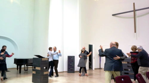 Ein modernes Holzkreuz hängt über dem Altar und wirft einen Schatten, der wie offene Arme erscheint – das ist der Gedanke hinter dem Konzept der Kreuzeskirche. Sie soll ein Ort der Achtung und Wertschätzung aller Teile der Gesellschaft sein – auch und besonders derer, die keinen Bezug zur evangelischen Kirche haben.