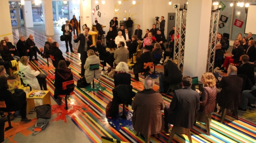 Gelsenkirchen, 28.02. - Die Veranstalter von Urbane Künste Ruhr hatten sich wirklich Mühe gegeben. Im Bahnhofscenter waren Drehstühle mit farbigem Klebeband am Boden befestigt - für eine dynamische Kommunikation wertvoll - und am Ende war ein Tisch mit schmackhaften Häppchen, (alkoholfreiem) Bier, Wein und Wasser aufgestellt - für eine entspannte Kommunikation wertvoll. Kommunikation - das ist es, worauf Urbane Künste Ruhr, eine der vier Säulen von Kultur Ruhr GmbH, aufbaut, um das oberste Ziel, die Stärkung der bestehenden Netzwerke, zu erreichen. Das Ziel war zugleich titelgebend für den zweiten Ruhr Salon am Donnerstag Abend. Geladene Redner sollten über ihre Netzwerkerfahrung sprechen, die Gäste, vorwiegend selbst in Kulturinitiativen tätig, sollten ihrerseits ihre Erfahrungen einstreuen. Ein wenig Empirie war bei dem recht abstrakten Begriff geradezu notwendig, wie sich schnell herausstellte.