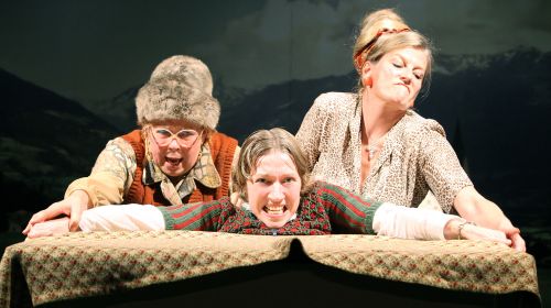 Auf der Bühne sitzen beim Entree bereits die drei Protagonistinnen am Küchentisch und starren in einen erbärmlich kleinen Fernseher, in dem der heilige Ratzinger gerade eine Rede hält, voller Andacht und Ehrfurcht, aber immer bemüht, den eigenen Platz auf der viel zu schmalen Couch zu behaupten. Ein schönes Bild, symbolisiert es doch bereits hier die eigentliche Haltung des Trios, die innerlich bereits den Widerstreit bei aller gespielten Harmonie sucht. Diese Frauen wollen auf ihre ganz persönlichen Träume nicht verzichten, trotz aller aufgesetzten Frömmigkeit, trotz aller offensichtlichen Armut. Die Inszenierungen von „Die Präsidentinnen“ – Schwabs Dauerbrenner aus den 1990er Jahren – leben immer von der Qualität der drei Schauspielerinnen. Brandis hat in Essen mit Ingrid Domann (Erna), Ines Krug (Grete) und Bettina Schmidt (Mariedl) ein infernalisches Schwab-Trio beisammen, das nicht nur die schwabische Kunstsprache, sondern auch seine Choreografie zwischen Tisch und Couch und der Postkartenlandschaft-Videoleinwand perfekt beherrscht. Da merkt man, wie gut der Text vom genialen Österreicher, der auch Künstler war, wirklich ist. Und Brandis lässt sie beim Erzeugen der Figuren auch körperlich ackern, die Anstrengung ist spürbar, wie Schwab es wollte.