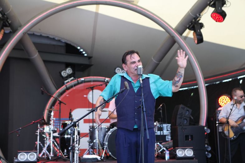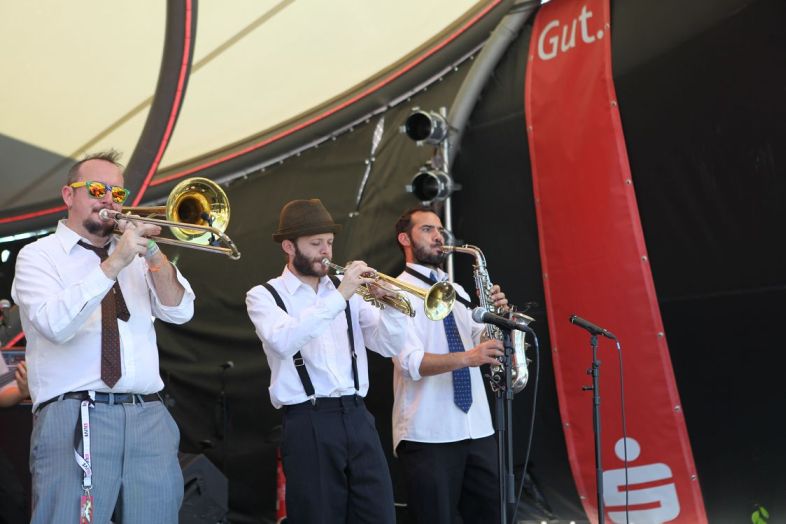 Mit Paperstreet Empire ging es gleich um 17 Uhr mit einem echten Newcomer in die Vollen. Die Gewinner des HEINZ-Preises im Rahmen des Förderprojektes „Made in Essen" der Sparkasse Essen hatten sich ihren Slot in jüngster Vergangenheit redlich erspielt und konnten zudem mit ihrem Heimvorteil punkten. Ihr Offbeat-lastiger Indie-Rock ließ die ersten Menschen in der Sonne tanzen und auch die Band selbst gab alles, obwohl sie ganz richtig konstatierten, dass „leider noch nicht Nacht“, sondern „Nachmittag“ ist. Nach jenem gelungenen Auftakt, gab es die nächsten Offbeats auf der Sparkassen-Bühne. Rosario Smowing, acht Argentinier mit Blasinstrumenten bewaffnet, sorgten für die erste musikalische Weltreise des Festivals. Irgendwo zwischen Swing, Ska, Jazz und dem modischen Stil der 40er Jahre performte die Band 30 Minuten auf höchstem Niveau. Sowohl musikalisch als auch visuell ein Erlebnis.