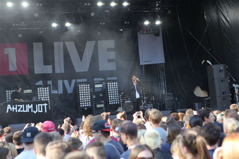 Auf der 1Live-Bühne hatte es sich mit Ahzumjot der erste Rapper gemütlich gemacht. Angekündigt wurde der junge Mann als von Zukunftsängsten geprägter Twen, der zwischen „täglichem Stress und Abhängen mit Kumpels, Model-Jobs und kein Geld für Miete“ den Überblick verliert. Es klingt, als gäbe es bemitleidenswertere Zustände und auch Ahzumjot selbst machte bei seinem Auftritt nicht den Anschein eines gebrochenen jungen Mannes. Vielmehr überzeugte er mit seinen von trockenen Drum Beats getragenen Songs, die mal an Cro und in den düsteren Momenten an Casper erinnerten. Mit „Späti“ konnte der Berliner schließlich auch alle mit Trinkhallen und Kiosk aufgewachsenen Ruhrpottler für sich gewinnen. Trinken verbindet, so die Botschaft.