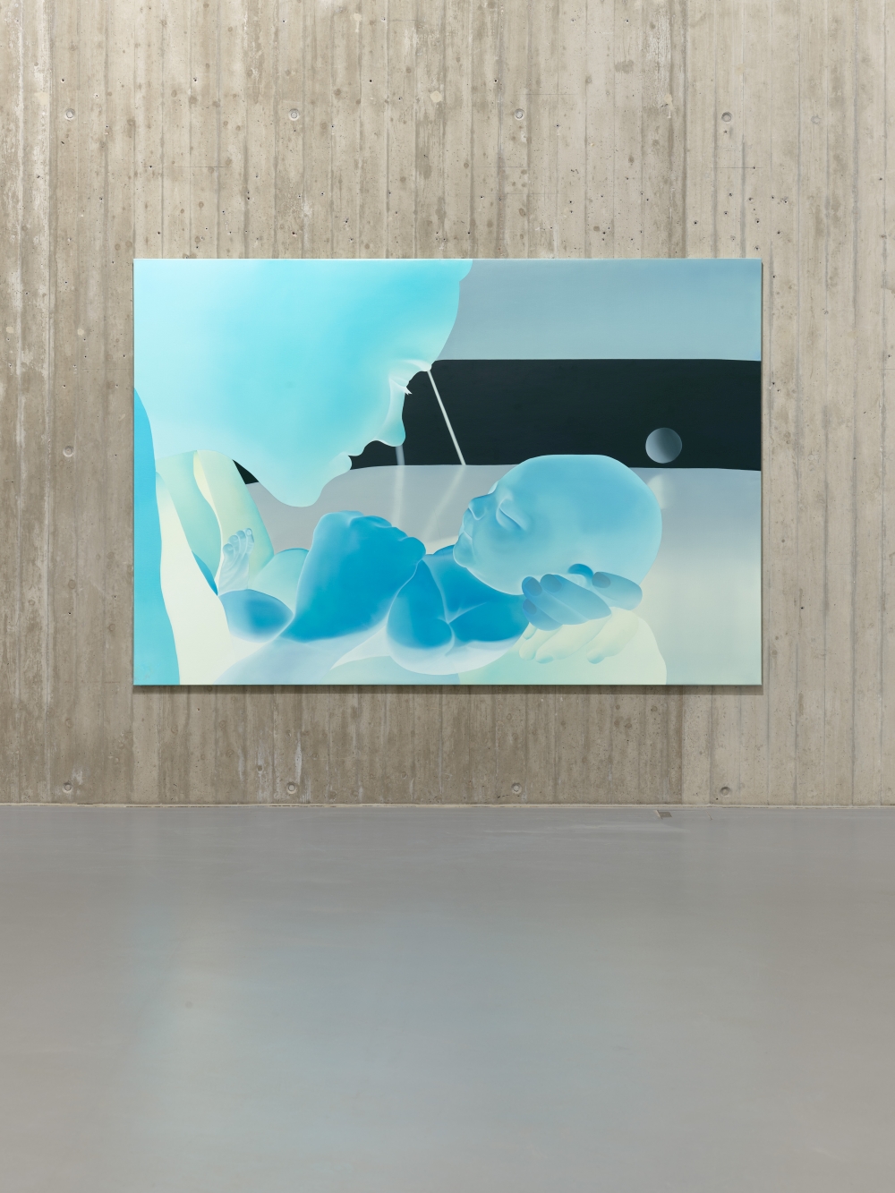 Vivian Greven, Ausstellungsansicht WATER, Neue Galerie Gladbeck 2023, © Künstlerin, Foto: Ivo Faber, courtesy Künstlerin und Neue Galerie GladbeckAndererseits lassen Grevens Bilder an LC-Displays mit ihrem kristallinen Fluidum denken, die als rein artifizielle Oberfläche Vergegenwärtigung von etwas Abwesendem sind. Sie vereinen beides. Mit dem Lichten in der Tiefe, über dem in der klaren Konturierung Positiv- und Negativflächen umschlagen, und dem leicht Erhabenen hin zum Relief, das sich über der Fläche wölbt, sind Vivian Grevens Bilder wahrhaftig gemalt. Die vielen Schichten Öl- und Acrylfarbe erzeugen eine substanzielle Präsenz, die sich fein über dem Stoffgewebe abzeichnet.