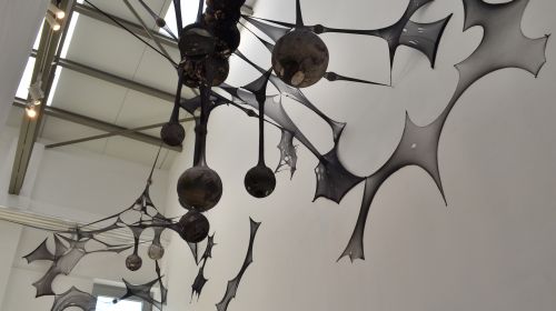 Der Verein Solinger Künstler betreibt seit 1979 die Galerie SK in den Güterhallen. Es sind zum Teil schmale doppelstöckige Räume, die ungewöhnliche Raumsituationen geradezu herausfordern. Bei„not really small“ wandern die vertikalen Flächen durch die Nylonnetze, auch in die Horizontale, gespiegelt von Licht und den informellen Papierarbeiten an der Wand, kann der Besucher seinen Blick in dieser Ausstellung in alle Richtungen frei lenken und stößt doch immer wieder auf Interventionen, die ihn halten, verführen und neu sammeln lassen. Gerade durch die Wechselwirkung der verschiedenen Arbeiten und ihrer spezifischen Haltung untereinander wird das zu einem sinnlichen Rundgang, denn die Vernetzung findet nicht nur zwischen den Wänden, sondern auch im Amalgam der Kunstwerke der beiden Künstlerinnen statt. Beide arbeiten mit unterschiedlichen Objets trouvés, mit gefundenen und für die Arbeiten umdefinierten Gegenständen, haben diese in Solingen aber auch für ein inszeniertes Gesamtwerk konzipiert.