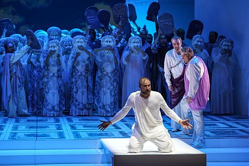 Ärgerlich störend und szenisch irrelevant wirkt auch der Chorauftritt im ersten Aufzug, bei dem ratternd hereingerollte Gerüste die Musik erheblich stören. Auch Lena Schmids silbrige Overalls für den Chor verrätseln eher, während sie mit dem schlichten Weiß der Protagonisten und mit spielerisch antikisierenden Gestaltungselementen sonst eine glückliche Hand beweist.