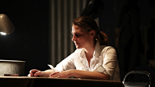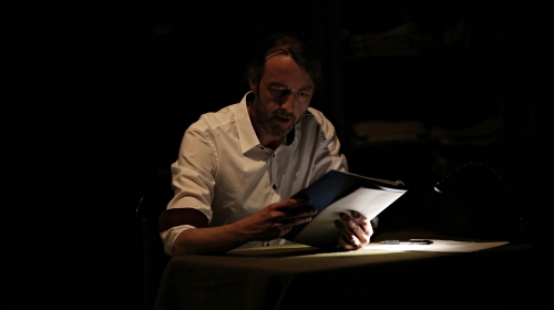 Darüber, dass solche Verse eine aggressive Außenpolitik gutheißen? Oder über die Performance und Inszenierung der Actionlesung „Weltenbrand“ an sich? Die ist nüchtern, ja, fast emotionslos. Genauso wie die Bühnengestaltung: Die SchauspielerInnen Tanja Grix und Jörg Schulze-Neuhoff, beide in dezenten weißen Hemden, sitzen hinter den Lichtkegeln der Schreibtischlampen am Pult. Gelegentlich werden Hefte aus den Regalen geholt, dann wird weitergelesen. Man könnte sich also darüber aufregen, dass ein didaktischer, pazifistischer Zeigefinger ausbleibt. Das ist das theatralische Moment der Lesung an diesem Abend – eine nüchterne Performance des Eingedenkens: Unkommentiert, dreckig und mit brutaler Wucht – als wäre Walter Benjamins Rede davon, dass nichts ein Dokument der Kultur ist, ohne zugleich eines der Barbarei zu sein, der Lesung in die Glieder gefahren.