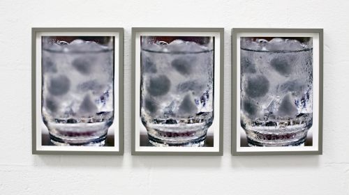Die Aufnahmen lenken den Blick auf ein teilweise mit Eiswürfeln gefülltes Glas. Das Gefäß selbst füllt fast die gesamte Bildfläche. Kondenswasser am Tand, aber auch die unscharfen Konturen des schwimmenden Eises bilden, je nachdem welche Tiefenschärfe eingestellt wurde, neue Konstellationen einer optischen Dreidimensionalität, die, obwohl vom selben Objekt erzeugt, immer wieder neue unterschiedliche Abbilder schafft. 16 kleinformatige Fotos bilden auf der weißen Wand ein Tableau, das selbst wie ein Abbild dieser Dreidimensionalität wirkt. Das Glas reflektiert dazu seine Umgebung, die nicht konkret erlebbar ist, aber in teils farbigen Spiegelungen präsent scheint.