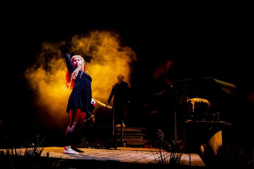 Lernous, der an gleicher Stätte mit seiner geschlossenen Schlachthoftruppe (Abattoir Fermé) schon Wedekinds „Lulu“ auf die Bühne gedröhnt hatte (inklusive Bratwurst grillen) läßt es diesmal etwas stiller, aber nicht weniger abstrus angehen. Für den Plot im heruntergekommenen Königshaus aufm Campingplatz hat er mit dem Ruhrgebiets-Barden Tom Liwa ein paar Songs für den leichten Musiktheater-Abend geschrieben; Bier in Dosen gibt’s auf der Bühne an jeder Ecke, ne wackelige Showtreppe auch. Alles Sein auf der Bühne soll eingebettet werden in die Befindlichkeit des armen US-amerikanischen Südens, wo Gewalt und Gospel eine Melange aus Sozialhilfe und Lynchjustiz bilden. So jedenfalls erklärt die Regie das Bild auf der Bühne. Alles nur aus schmerzverzehrter Langeweile, in die Jochanaan an einem ganz normalen Tag wie Michael Douglas einfällt und mit seinem Bürohengst-Habitus die junge Frau betört. Nun ist Tom Liwa nicht die Tiger Lillies und Salome nicht Lulu und Daniel Rothaug nur optisch William Foster (leider). Also lobet den Herrn und betet an das Ungeheuer. Wer knutscht schon einen angeschnittenen Kopf?