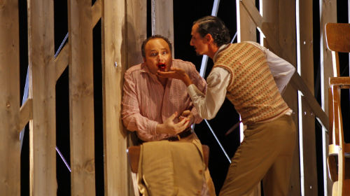 Das Böse ist allgegenwärtig. Wie ein Geist umschwirrt Samiel ständig das Geschehen irgendwo im Böhmerwald. In der Wuppertaler „Freischütz“-Inszenierung von Andrea Schwalbach spielt Marco Wohlwend ihn als konservativen Teufel mit abgenutzter Aktentasche. Und dennoch geht das nicht ohne Blut ab. Die romantische Oper von Carl Maria von Weber wird hier zu einer Schlachtorgie zwischen Voodoo und Jägerlatein, die stolzen Wälder sind da längst abgeholzt und zu Brettern verarbeitet, so dass Wild und Mensch kaum noch Verstecke finden. Schwalbach hat zudem und ziemlich außergewöhnlich der Figur des Samiel Textpassagen zugeschoben, so dass er sich immanent im Spiel bewegen kann und an allen Handlungen nicht nur aus der Ferne beteiligt ist. Das ist anfangs verwirrend, aber wirkt rasch ziemlich überzeugend.