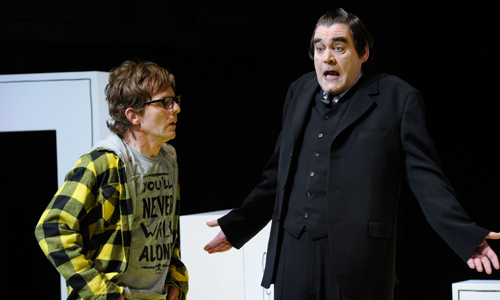 Die Inszenierung von Tilman Gersch am Schauspiel Essen changiert zwischen drei konträren Zuständen: Ironie, Groteske und Sentimentalität. Zwischentöne gibt es nicht. Grotesk wird es spätestens, als der Tod merkt, dass die normale letale Verwaltungsroutine ins Stolpern gerät. Stau im Kundenbüro? Verwaltungsreform im Hades? Wechsel im Aufsichtsrat der Schnitter? Ein zweiter, hochblondierte Tod (Jan Pröhl) mischt sich ein ins offensichtlich umkämpfte Todesgeschäft und fordert den Kollegen zum Titatenkampf heraus. Damit beginnt der Wettlauf um den kleinen Sohn des Helden, aber auch die Kitsch und Sentimentalitäts-Dröhnung der Inszenierung. Schon mit der eingesammelten Mutter des Helden (Ingrid Domann mit bestimmter Betulichkeit), spätestens aber mit dem Auftritt des Sohnes des Erzählers (Aron Gergely) wird die Schleimspur der Rührseligkeit immer breiter. Der Sirup des Gefühlsdusels nimmt trotz ironischem Antidot hollywoodeske Züge an, als sich Tod 1 und Tod 2 zum Showdown treffen. Am Ende hat man 100 Minuten seelisch ballaststofffreie Unterhaltung genossen, braucht aber dringend eine Sentimentalitäts-Entschlackungskur.