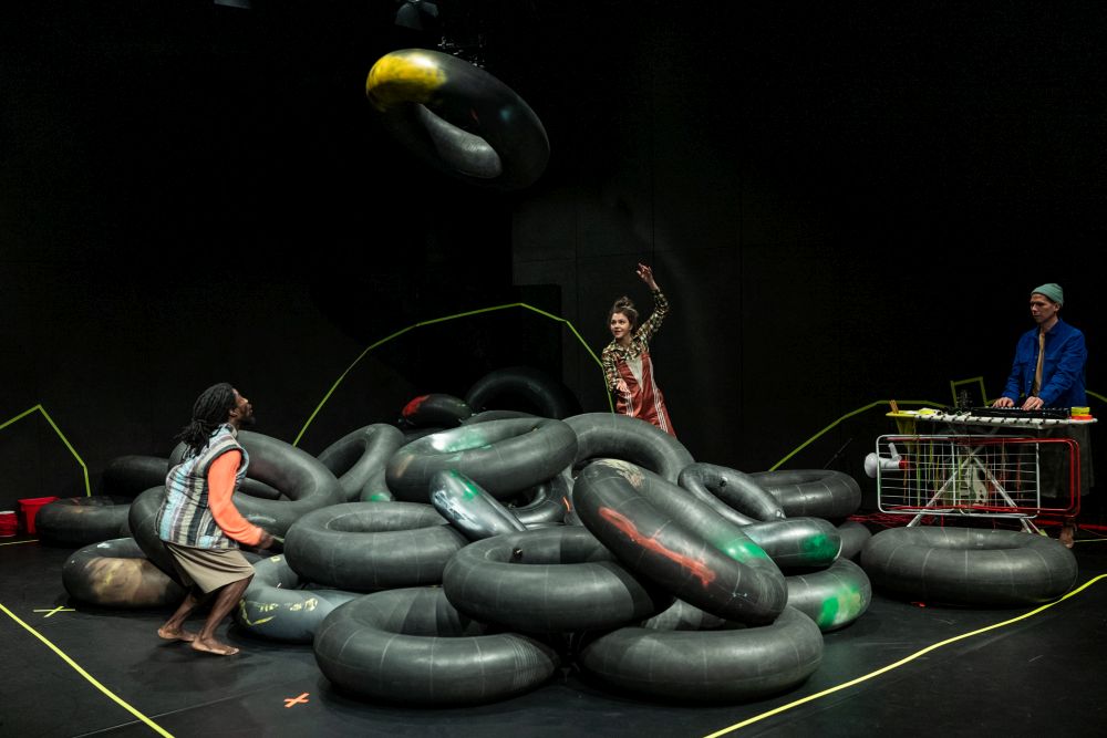 Schon der Literaturkritiker und Philosoph Walter Benjamin wusste, „dass die Erde voll von den unvergleichlichsten Gegenständen kindlicher Aufmerksamkeit und Übung ist.“ Das gelte gerade für Arbeitsstätten wie Baustellen, wo allerhand Verwertungsreste anfallen. Denn mit diesen „Abfallprodukten“ bilden die Kinder, so Benjamin, „die Werke von Erwachsenen nicht sowohl nach als sie diese Rest- und Abfallstoffe in eine sprunghafte neue Beziehung zueinander setzen. Kinder bilden sich damit ihre Dingwelt, eine kleine in der großen, selbst.“ Unter anderem mit einer Masse an Autoreifen beschwört auch das Stück „Unsere Grube“ der Performancegruppe Pulk Fiction den kindlichen Spieltrieb in einer Welt voller Dinge, die die Erwachsenen eher an Verwertung und Zweckmäßigkeit bemessen.