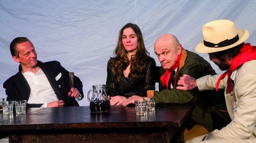 Weiße Leinentücher zirkeln einen rechteckigen Raum in die Oberhausener Kirche. Drei dunkle Tische, ein paar Stühle, fertig ist das Bühnenbild. Hartmut Stanke macht als Hotelbesitzer Juanito Montoya den Erzähler, der die Spielszenen kettet, die von Paris nach Pamplona und Madrid führen und in denen eine Menge menschliche Tragödien dokumentiert werden. Die Schauspieler haben kurze Wege, nur eine Empore lässt die Sichtachse in der Kirche nach oben wandern, ansonsten sind die Zuschauer auch mal teilnehmende Ochsen. Oder vielleicht nur die wackere Kuh für Amateure?