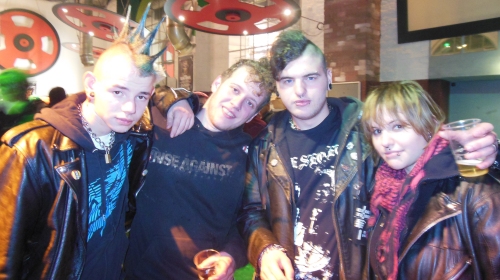 Wie der erste verläuft auch der zweite Tag von Deutschlands größtem Indoor-Punkfestival laut offizieller Polizeimeldung ohne Zwischenfälle. Rangeleien finden auch eher bei An- und Abreise statt. Mittendrin fühlt sich auch wohl, wer ohne prachtvollen Iro oder Nietengürtel angereist ist und sich nachts zum Duschen und Schlafen heimlich rausgeschlichen hat. Anschluss findet sich schnell. Ein netter Typ möchte mir seine Freundin für vier Bier verkaufen, während ein kleiner Minipunk Geld für seine Rückfahrt zum Bodensee sammelt. Ein Besucher aus Zürich flüstert mir zu, dass er sich vor angeblich anreisenden Schweizer Neonazis fürchtet. Die scheinen aber lieber daheim geblieben zu sein. Angesichts der verstärkten Übergriffe im Ruhrgebiet im Dezember - im Anschluss an das Pressure Air-Festival im Oberhausener Druckluft und an einem S-Bahnhof in Bochum - ist die Harmonie eine angenehme Überraschung.