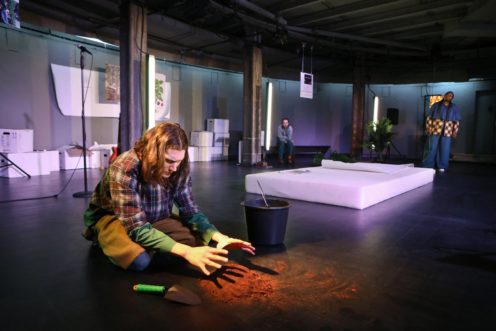 Soweit der Ausgangsplot, der natürlich erst einmal nix mit einem Maulbeerbaum zu tun hat. Der steht eher für die Sehnsucht nach der vergangenen heilen Welt der Kindheit, aber eben auch für eine kalte Fremde, die ein Wachstum dieser Pflanze nicht möglich macht. Gvenetadze inszeniert ihre Parabel an das Nicht-Ankommen in einer neuen Heimat, die keine sein will, in ruhigen fast stillen Szenen, die ein kontinuierliches Folgen der Monologe manchmal schwierig machen, insbesondere wenn die Schauspieler:innen mit dem Rücken zum Publikum sprechen. Da werden nun Zimmerpflanzen und Papierbahnen bewegt, Marius Huth hat Maulbeerbaumsamen im Gepäck, die er trotz aller klimatischen Widerstände pflanzen will, auch das eine Art Gleichnis auf die Versuche, im fremden Land Fuß zu fassen. Aber selbst ein schützendes Gewächshaus aus Leiter und Folie hilft da nicht, auch keine Musikzitate der Band.