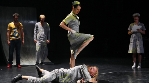 Was ich immer wieder bewundere, ist, wie viel man mit dem Bewegungsrepertoire tatsächlich machen kann. Erst einmal denkt man, schon gesehen, wieder Hip-Hop, Breakdance, modern mixing, aber dann verselbstständigen sich die Moves, schaffen sich eine eigene Welt, in der sie so schlüssig sind, wie Spitzentanz beim Schwanensee. Zwischen Physical Theatre und modernem Tanz spült der clevere Randle Patrick McMurphy das Chaos in den Skatepark, der von der mal bösen, mal verwirrten, aber wie immer genialen Lotte Rudhart als Krankenschwester im dampfenden Kleid bewacht wird. Iwan Pawlow hätte seine Freude an den Hunden auf der Bühne gehabt. Klassische Konditionierung mit etwas Chemieeinsatz, nur einmal wird gesprochen: Medikamentenausgabe von der Empore, oder nennen wir es besser Skater-Kanzel. Unter dem live eingespielten Mega-Soundteppich vom Berliner jayrope rollen die Tänzer mit wahnwitzigen Bewegungen das Stück aus, einer mit kaputtem Knie, aber mit unglaublicherKontorsion selbstvom Rollstuhl aus, der andere mit dem typischen Nicholsonschen Grinsen. Ihn wird es am Ende hart treffen. Nach der Lobotomie ist nix mehr mit Chaos, dann heißt es Pawlow oder stirb. Da kennt die robotige Krankenschwester kein Pardon mehr.