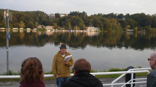 Eine Reise entlang der Ruhr soll es werden. Das Sommerstories-Projekt der Gegenwartsliteratur-Zeitschrift „Richtungsding“ sucht nach dem idealen Konzept für sommerliche Open Air-Lesungen. Für die verschiedenen Orte am Ruhr-Ufer werden GPS-Daten angegeben. Die jüngste Sommerstories-Lesung fand nun an der Regattabahn am Baldeneysee statt. Dem 2010 ins Leben gerufenen Richtungsding-Projekt für junge Gegenwartsliteratur geht es vor allem darum, neben anderen Literaturinstitutionen in der Region, eine unabhängige Plattform für unkonventionelle Formen von Literatur zu ermöglichen. Dafür stand an diesem Abend in gewisser Weise auch das Setting am Baldeneysee. Sommerliche Stimmung kündigte jedoch nur die Lesung an, eine diesige, frühherbstliche Luft legte sich stattdessen unter den an diesem Tag immergrauen Himmel.