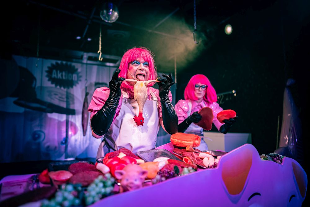 Aber nun zerstören erst einmal Karina (Emily Klinge) und Zarah Chi Chi (Matthias Heße) wort- und singgewaltig die Auslage ihrer Fleischerei. In gleichen rosa PVC-Lackkleidern und anfangs weißen Metzgerschürzen geht es darum, wie schlecht es dem Laden und den beiden geht, ob nicht auch Menschen zu Wurst verarbeitet werden könnten und ob nicht der Beruf selbst so hundsgemein sei. Das ganze bringen die beiden eher boshaft performativ über die Bühne mit kleinem Catwalk ins Publikum. Da fliegt das Fleisch, da laufen die beiden Rampensäue zu Höchstform auf, nur Spielfreude ist das nicht mehr, das hat eher schon orgiastische Züge. Auf einen Schlag wird es dunkel. Auftritt der mysteriösen Frau Müller, die Roman Mucha köstlich-schrullig-boshaft mit krummen Beinen, Handtäschchen und klitzekleinem auf Knopfdruck bellenden Hündchen meistert.